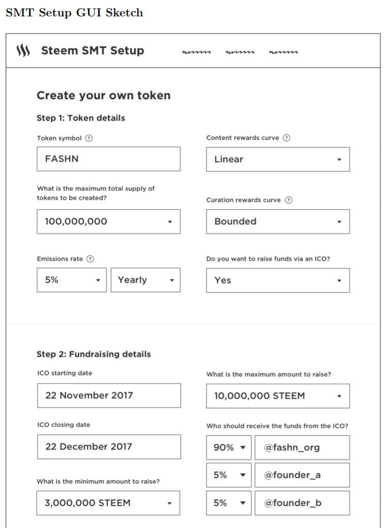 A Designpod token could be used by token holders to vote on Designpod project proposals, and like Steem would have a similar inflation schedule. Below is the proposed SMT user interface from the White Paper, for reference.