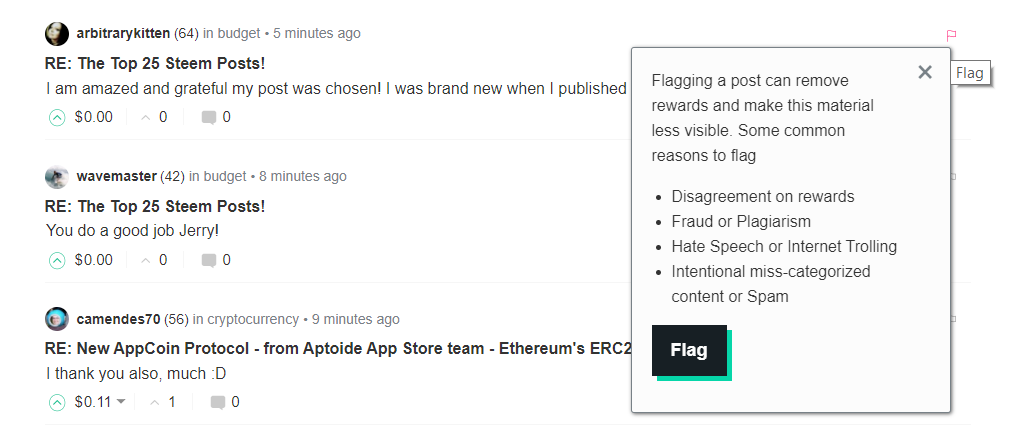 Vous pouvez aussi signaler un contenu, s'il ne vous plaît pas ou que vous pensez qu'il nuit à la communauté. Si les utilisateurs s'accordent pour flag un contenu, il sera tout simplement retiré et l'utilisateur perdra des points d'influence.