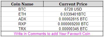 Ripple still on moon way and hit 7500 stoshi and now it is around 7000 stoshi. Ripple is already goin up and up from last 3 days but this last spike maybe was because of bitcoin also rising and is now around 6725 USD. ADX also hit 2800 stoshi and people who buy yesterday around 2700 stoshi now can take profit or can wait for more profit because price can go more up easily.