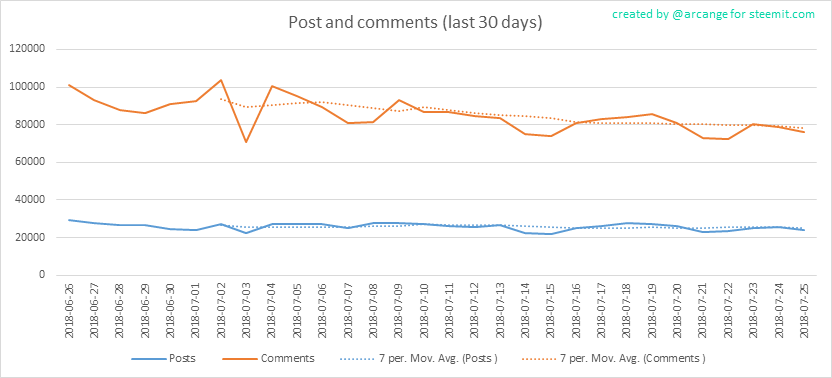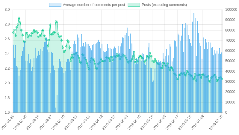 Der vollständigkeithalber Stelle ich auch wieder die 30 Tage Übersicht von @arcange rein. Der Downtrend ist auch hier erkennbar. Hatten wir Anfang März noch 180k Kommentare und 50k Posts, so halten wir jetzt bei ~90k Kommentare und 22k Posts.