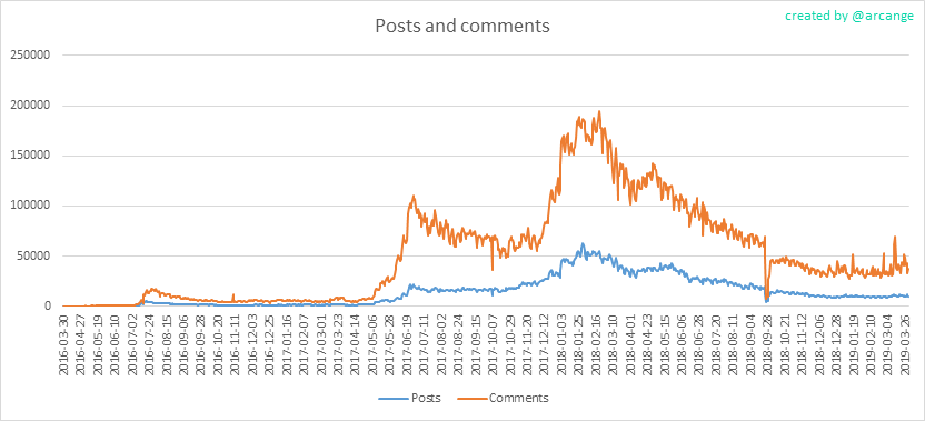 Die Zeitachse hat leider einen Anzeigefehler, aber jede Markierung entspricht einem Monat. Ich denke ihr könnt Euch hiermit selbst ein Bild über die Aktivität auf Steemit machen.