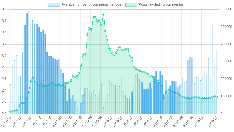 Kommentiert (blaue Balken) wird fleißig und brav, kommt sogar an das ATH von 2017 heran ...