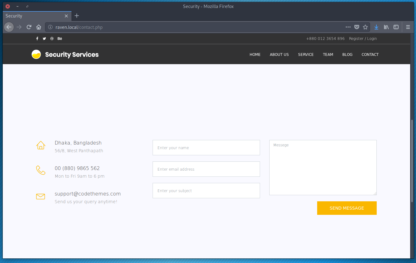 It’s another default load-out. The CSS was broken here like in Base Pentesting: 1, and called for the same fix by adding a new domain (raven.local) to my hosts file. Zero content here, so scan for vulnerabilities.
