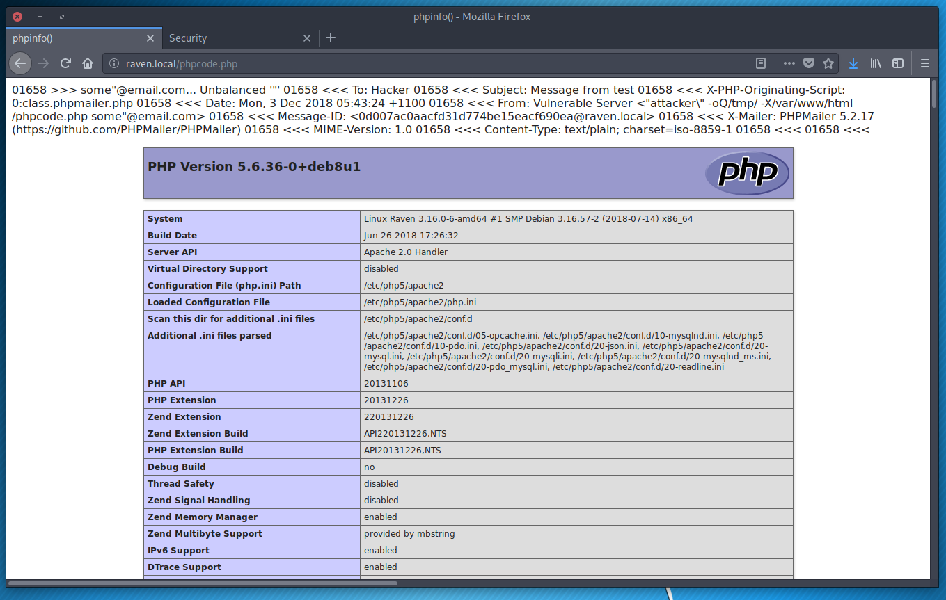 // mail() param injection via the vulnerability in PHPMailer
