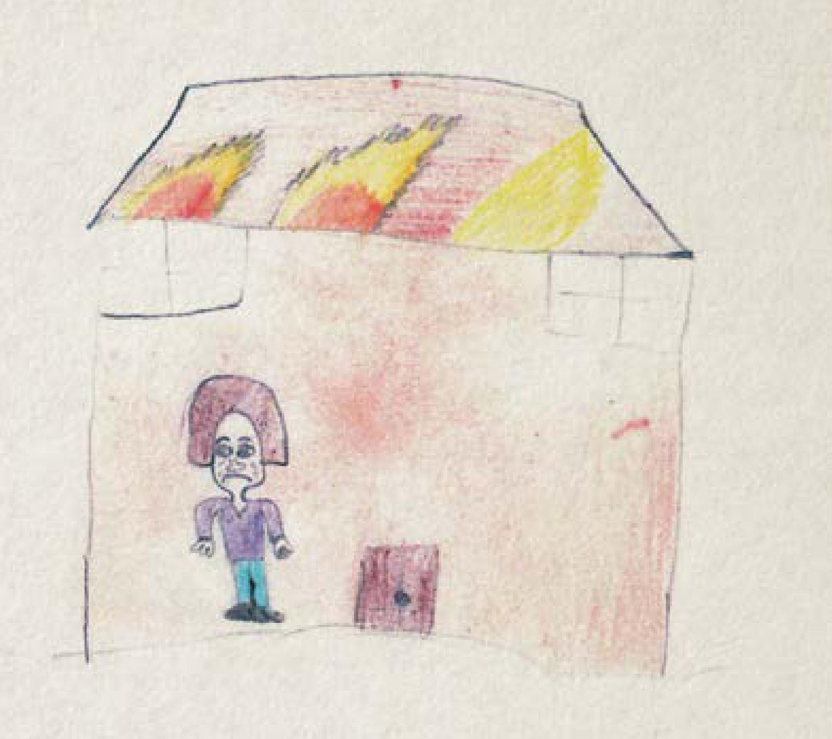 y así acabar de una vez por todas con la tortura que estuvo antes padeciendo. Como ultimo dibujo, alusivo a su más grande miedo, pinto la fachada de su casa con su familia. Ella coloco su gran puerta marrón, todas la ventanas de la parte de enfrente con su papá, mamá y su hermanito asomados en una de las ventanas superiores, su gran jardín, hasta su buzón donde se encontraba ella, Hannah. Luego de haber terminado de pintarlo y colocar cada detalle, encima de ese lindo dibujo familiar, empezó a rayar toda la casa sin mayor cuidado de dañarlo con mucha rapidez y fuerza de colores, roja, naranja y amarilla, hasta crear una especia de gran fuego, y de esa forma remato coloreando su gran casa totalmente incendiada. De último, dibujo las caras de su familiares donde todas, excepto la de ella, tenían rayas en forma de equis en los ojos y la boca, y la cara de ella tenía un gran aspecto de profunda tristeza, representando así la terriblemente muerte de todos y cada uno de los integrantes de su familia calcinados por las llamas en su lindo y querido hogar, quedando Hannah sola, triste y desprotegida.