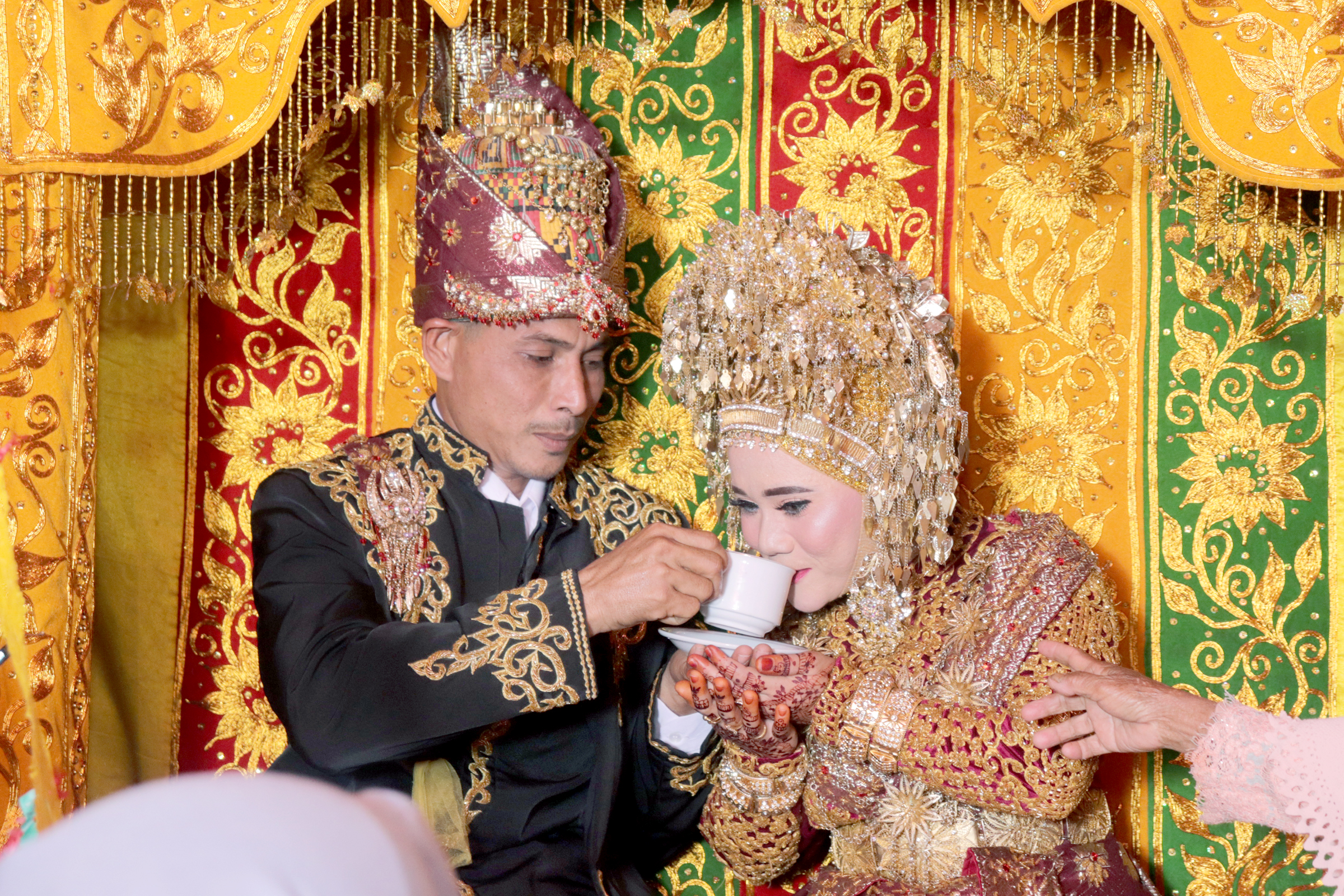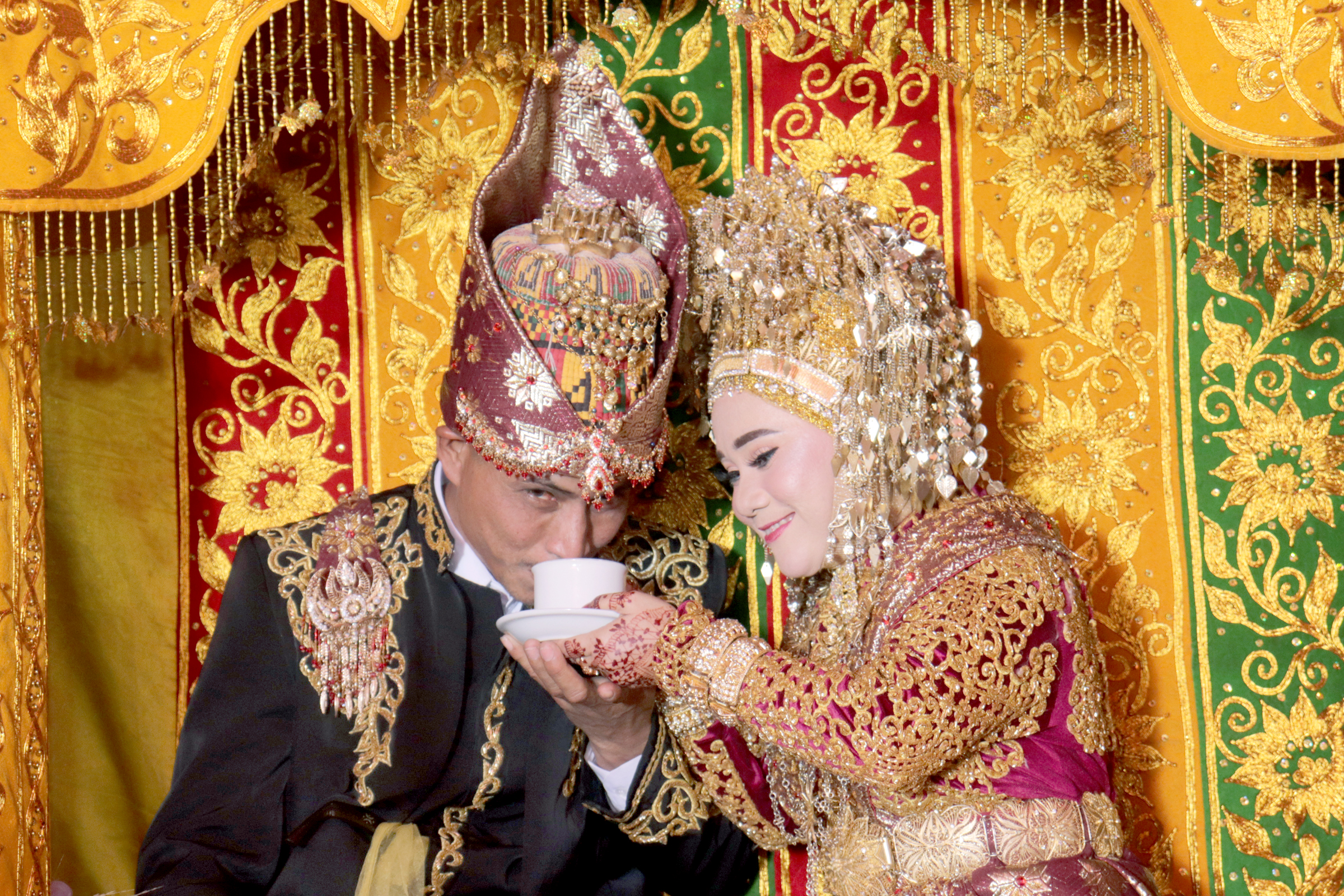 Pengantin wanita sedang menyuapi kopi kepada pengantin pria. (The bride is feeding coffee to the groom.)