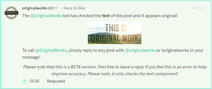 The operation of this bot is similar to that of @cheetah, with the difference that it is necessary to make a call in the comments of the publication by writing @originalworks or! Originalworks, if the bot does not find similar content on the internet, it makes a comment and give your vote to the author. Currently this bot is being reconfigured so it is temporarily paused.