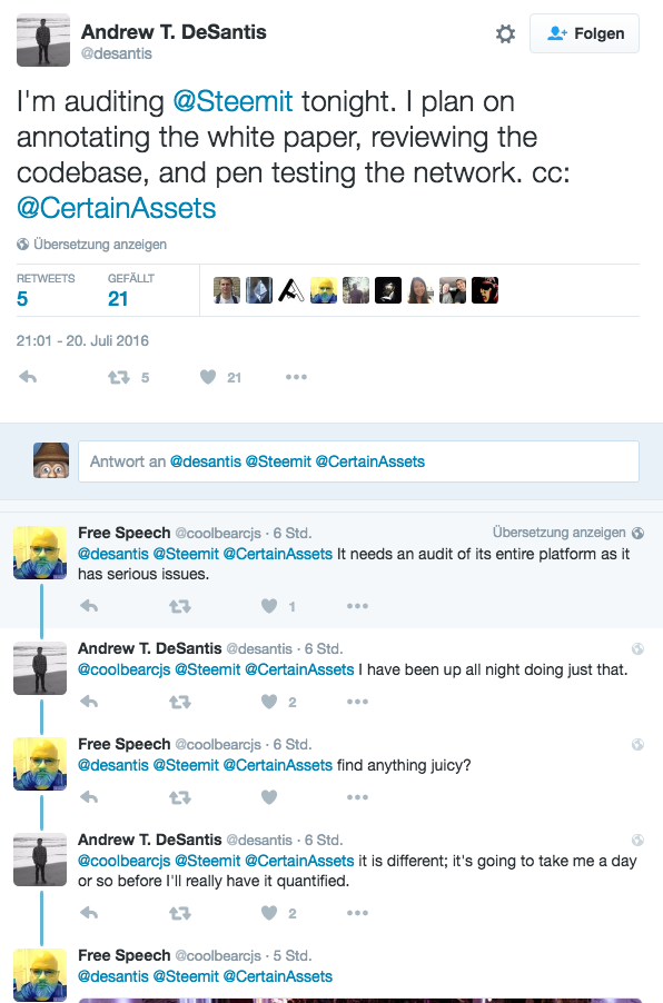 Andrew T. DeSantis (https://twitter.com/desantis) will audit the Steem platform tonight: