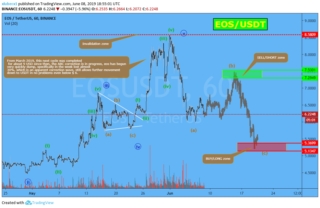 From March 2019, this next cycle was completed for about 9 USD since then, the ABC correction is in progress, eos has begun very quickly dump, specifically in the week lost almost 30%, which is an apparent correction wave, still allows further movement down to USDT in no problems even below $ 6.