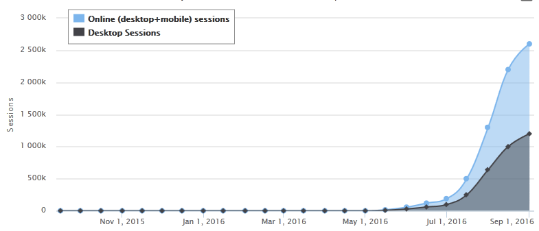 Traffic history for domain steemit.com, last 12 monthsjames1987 (47)in #steemit • 10 years ago Latest statistics for steemit.com website: estimated summary traffic is 2.6 Million visits per month, estimated number of visits from desktop computers - 1.2 Million sessions. As of September 01, 2016, Alexa rank is 9052. #steem #alexa