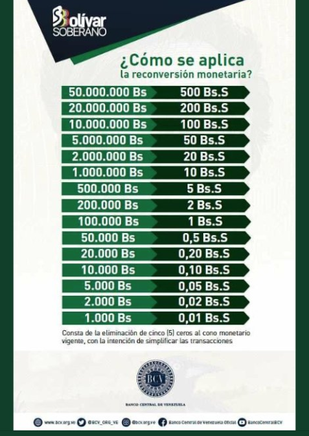 actualmente venezuela esta a horas de un cambio en su moneda... el cambio o reconversión monetaria consiste en eliminar cinco ceros a la moneda actual.. esto es debido a la gran inflación que sufre nuestra economía debido principalmente ala falta de producción dentro del país, venezuela no tiene suficiente producción por el contrario todo viene de las importaciones.. sumado las acciones fiscales por parte del gobierno no son las más acertadas....