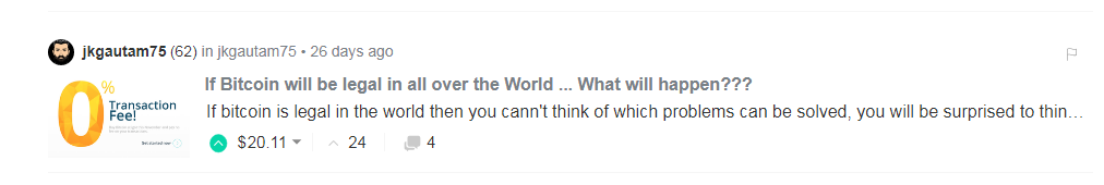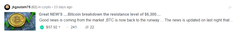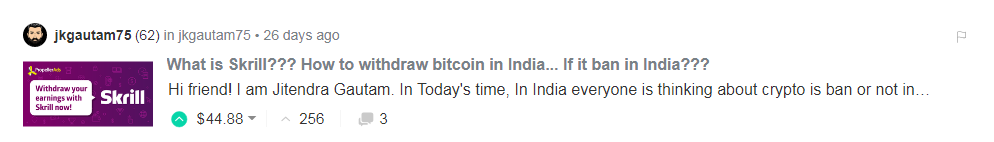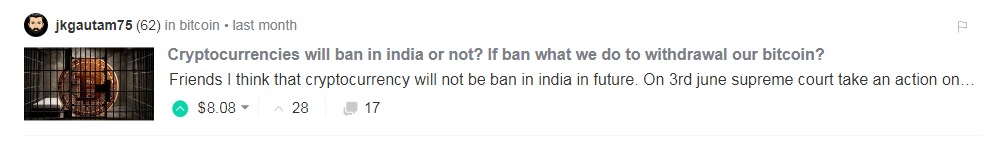 In this post I share my feelings why crypto ban in India or not. I get 28 upvotes and 17 comments on this post with earning $8.08 and I get $6.08.