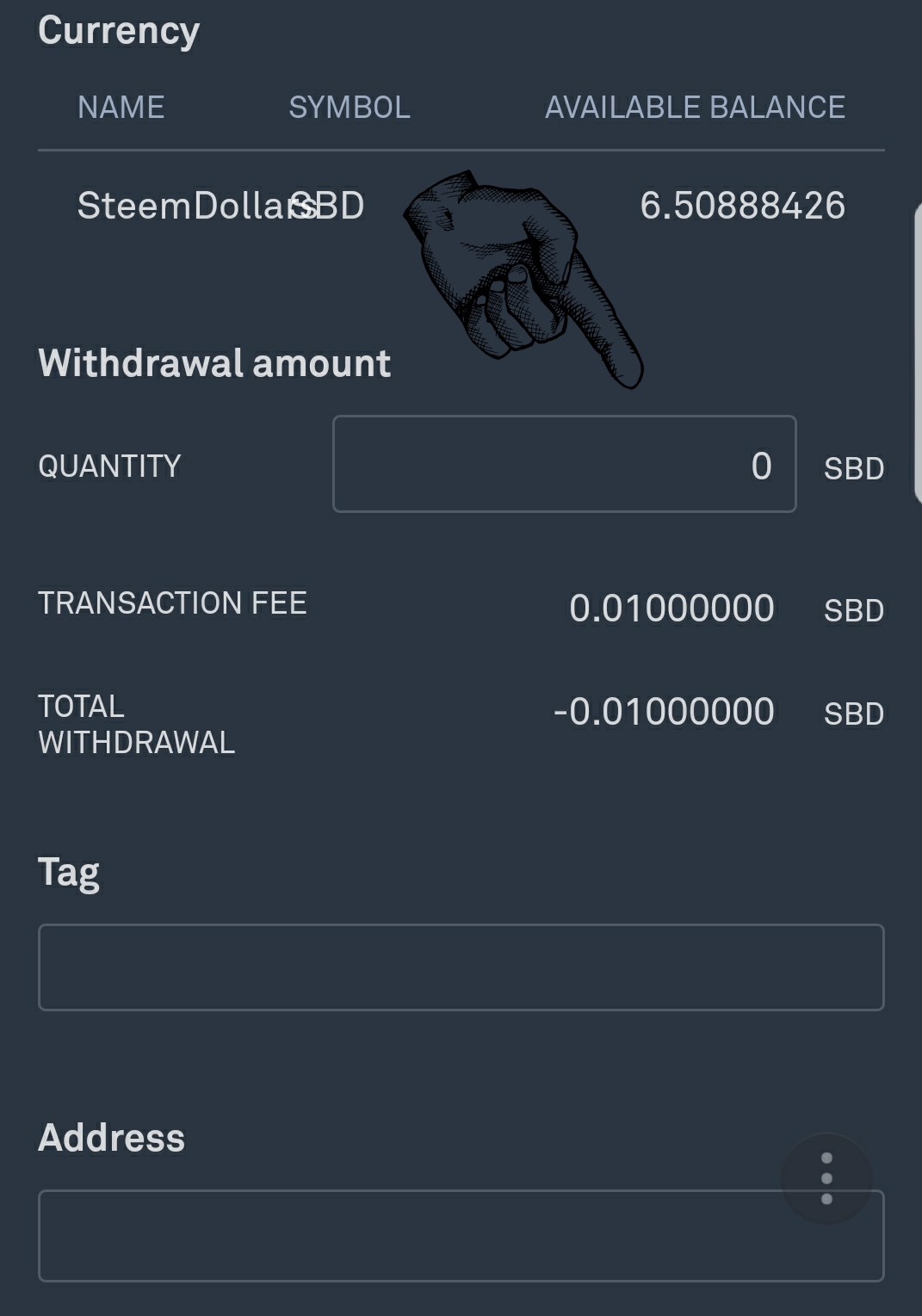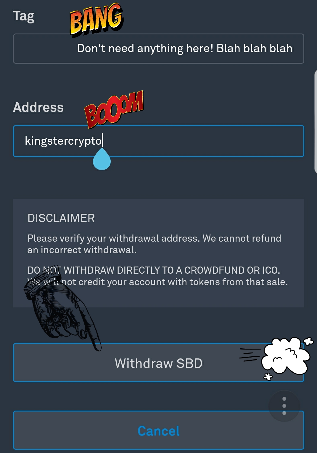 The box that says Tag you don’t need to put anything there. The box that says Address is where you put your Steemit account name. For example mine is kingstercrypto . Remember not to put the @ symbol in front.