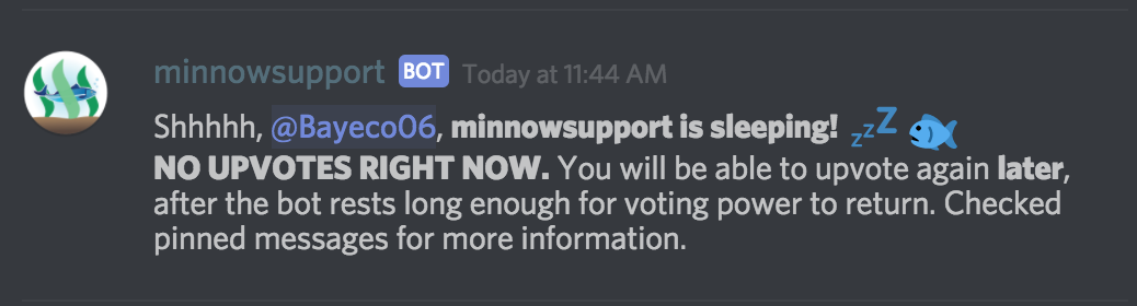 Mỗi ngày con bot phải đi ngủ để tăng lại vote power. Nên bạn phải quay lại lúc khác