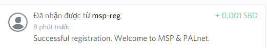 Còn trong ví của bạn ở Steemit sẽ hiện dòng chữ: Successful registration. Welcome to MSP & PALnet.