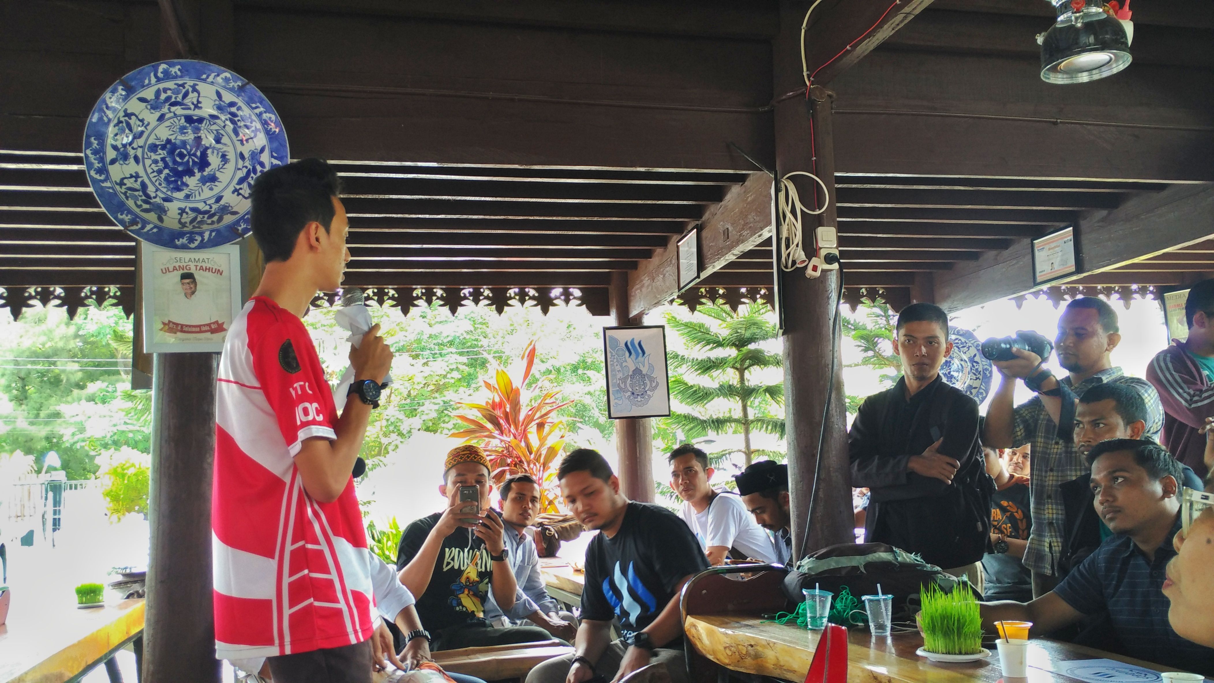 It was a rare moment to have, a meetup was directly led by a well-known figure @rismanrachman. He knew how to stir situation so that the meetup was so alive. He knew how to make the meetup atmosphere by distributing the "steemit flag" to whom they might address the speech.