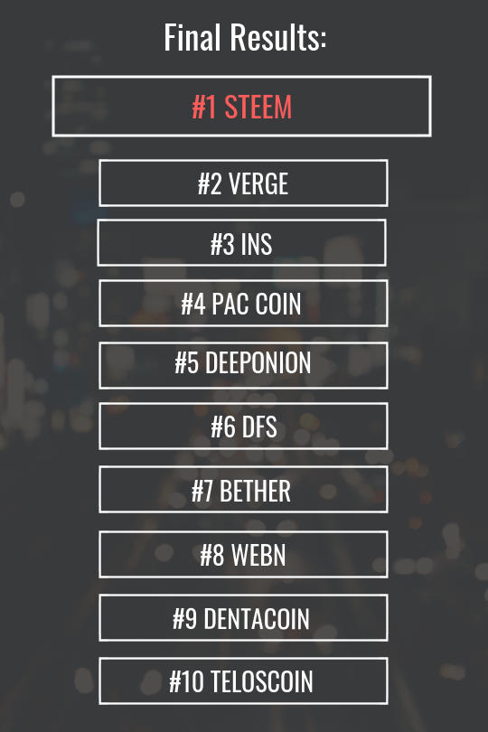 A big CONGRATULATIONS to the Winner STEEM and the rest of the Top 10! We've also chosen the random winner of the Crypto bundle and will be in touch via email - keep your eyes peeled. It has been a great pleasure hosting this contest and we hope you have all enjoyed the competition process. If you have any questions or concerns, please don't hesitate in reaching out to us.