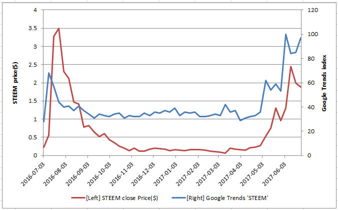 However, we can see that Google Trends and coin price of STEEM is almost exactly the same.