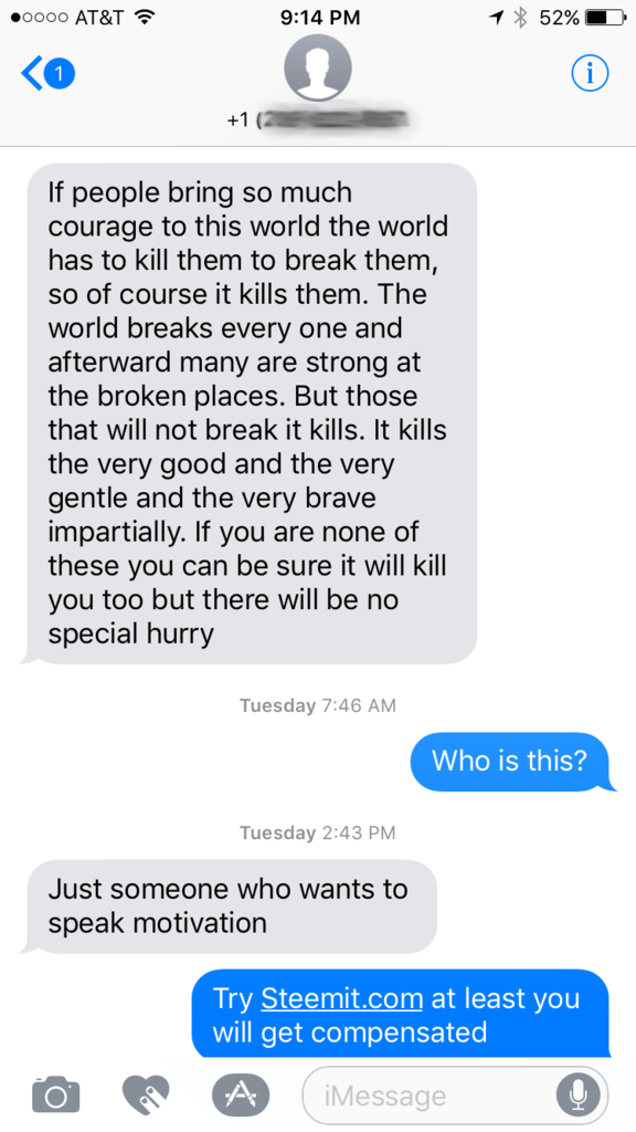 Or, better yet, they were sending out random texts to me because they were unemployed, but now they work for themselves as Steemian bloggers!