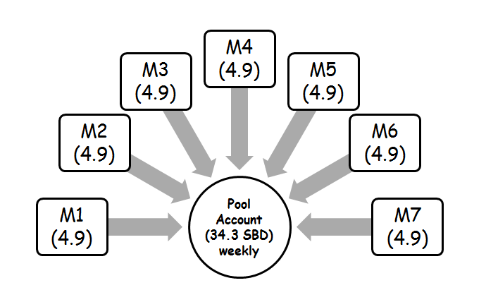 The result is that, every 7th day; each member (M) would have contributed 4.9 SBD to make a collective saved total of 34.3 SBD.