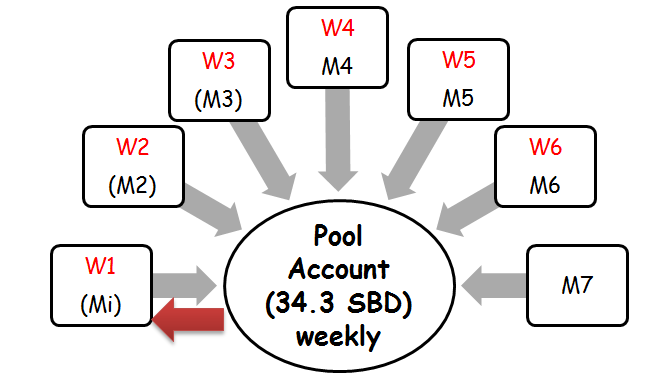 That 34.3 SBD is used to power up one of the 7 members, every 7th day (every week W) in the order agreed until 6 of the 7 members are powered up. This cycle will take 6 weeks.