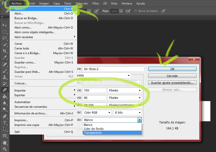 Once downloaded and installed Photoshop, we will proceed to open the program. We will go to "File> New", there should appear a box where the width and height will appear, it will go in Width 1000 and consequently, 100 in Height. Do not forget to place the new image with the background in "Transparent"