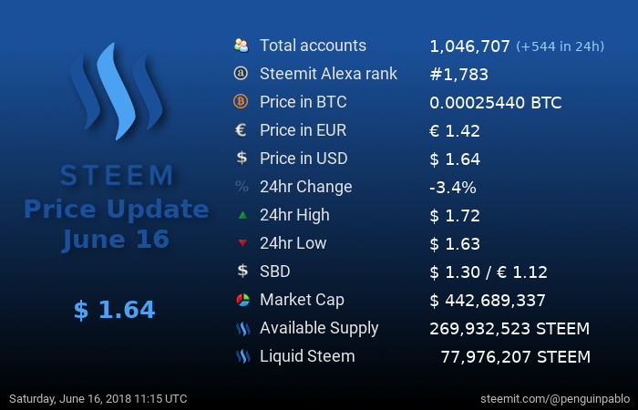 Welcome to my Steem Stats Report for Saturday, June 16, 2018. All data comes directly from the Steem blockchain and is based on UTC time.