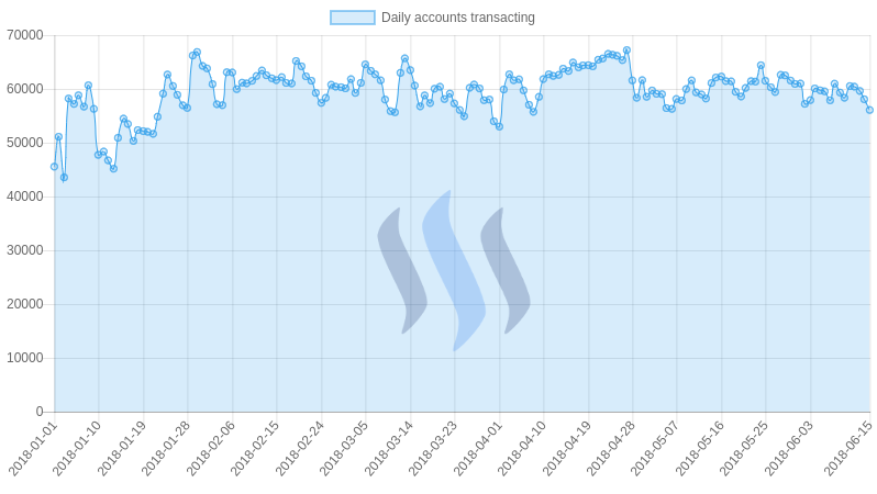 A 'transacting account' is a Steem account that made at least one transaction on the Steem blockchain. This can be a vote, post, comment, transfer, power up or sbd conversion. Users who only read from the Steem blockchain without interacting are not included. The actual number of 'Active users' is therefore much higher than the accounts transacting.