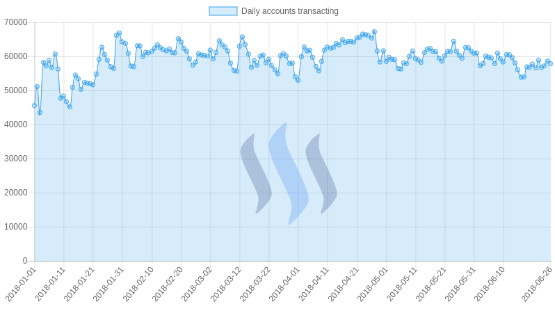 A 'transacting account' is a Steem account that made at least one transaction on the Steem blockchain. This can be a vote, post, comment, transfer, power up or sbd conversion. Users who only read from the Steem blockchain without interacting are not included. The actual number of 'Active users' is therefore much higher than the accounts transacting.