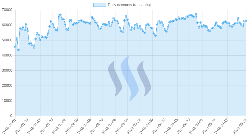 A 'transacting account' is a Steem account that made at least one transaction on the Steem blockchain. This can be a vote, post, comment, transfer, power up or sbd conversion. Users who only read from the Steem blockchain without interacting are not included. The actual number of 'Active users' is therefore much higher than the accounts transacting.