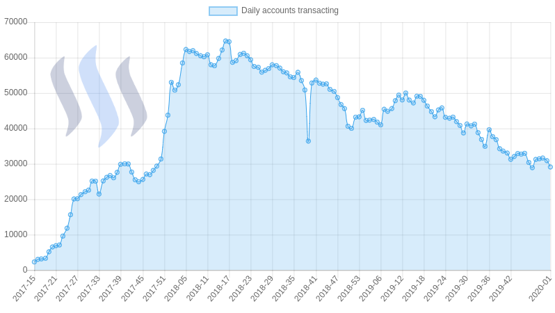 A 'transacting account' is a Steem account that made at least one transaction on the Steem blockchain. This can be a vote, post, comment, transfer, power up or sbd conversion. Users who only read from the Steem blockchain without interacting are not included. The actual number of 'Active users' is therefore much higher than the accounts transacting.