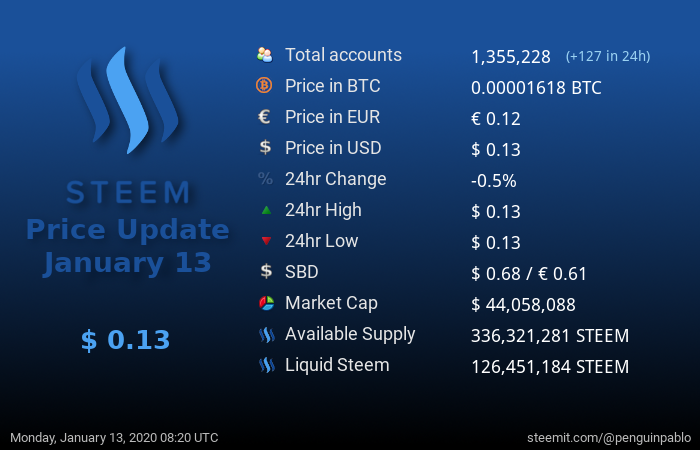 Welcome to my Steem Stats Report for Monday, January 13, 2020. All data comes directly from the Steem blockchain and is based on UTC time.