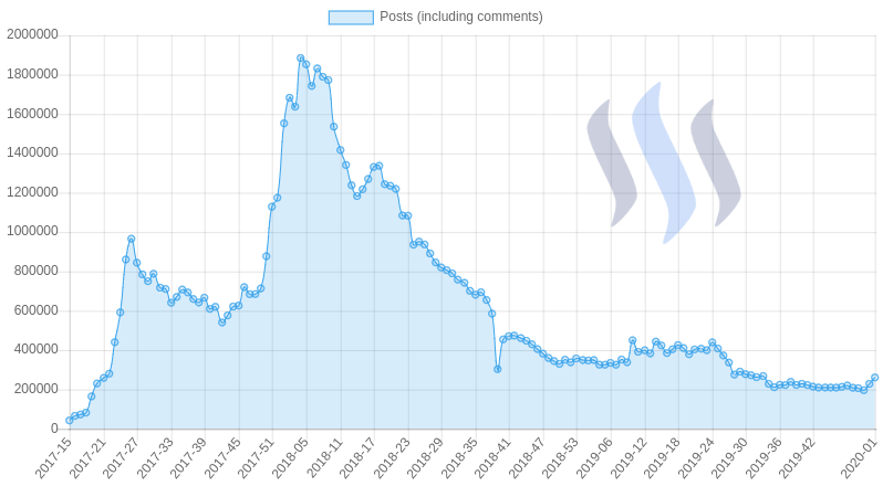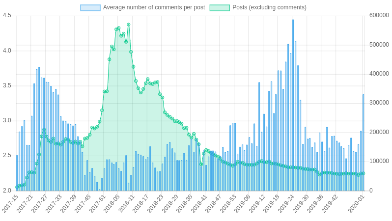 This is completely obvious. There are 59 675 posts in the first week of 2020, but the average number of comments is only 3.38. Many people are still focusing on writing blog posts, but only a few people cares about other people's blog posts.