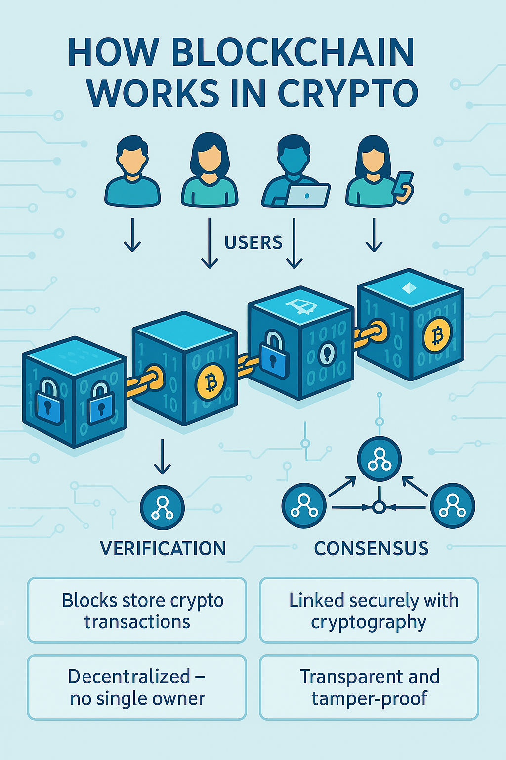 Each block is secured with cryptography, making it nearly impossible to tamper with past records.