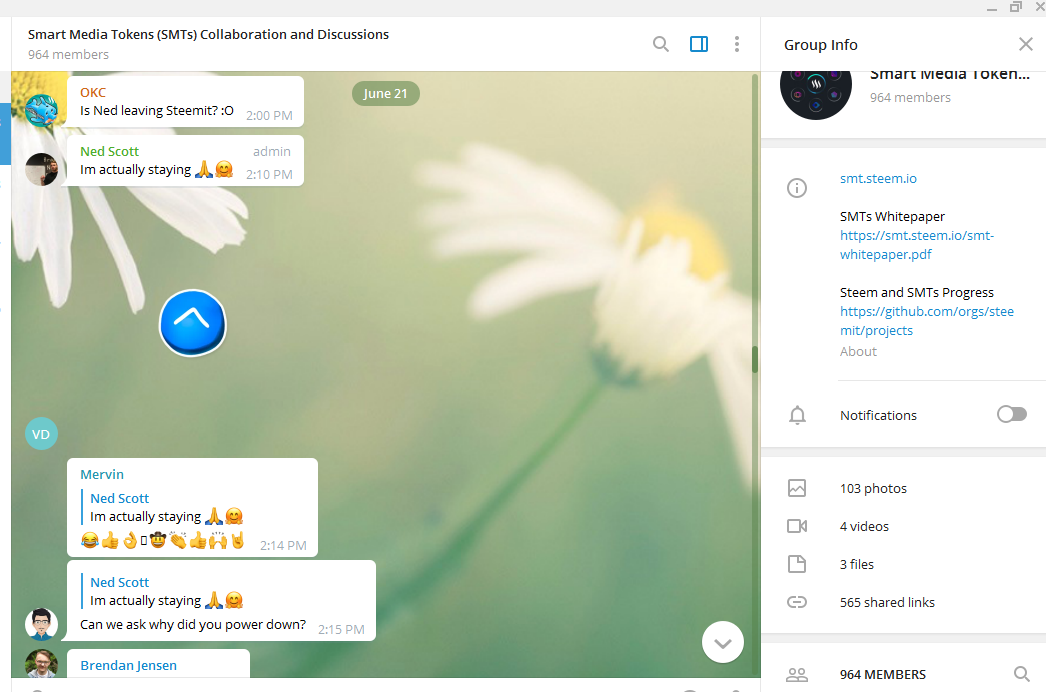In the Smart Media Tokens (SMTs) Collaboration and Discussions Group on Telegram which you can join here, @ned stated that he is not leaving steemit. Sure enough, there are speculations to the reason he is powering down. Some say it may be to avoid speculation anytime he powers down or sells to do something, others are of the opinion he is powering down to finance the SMT project.