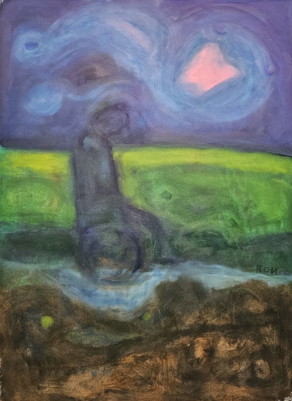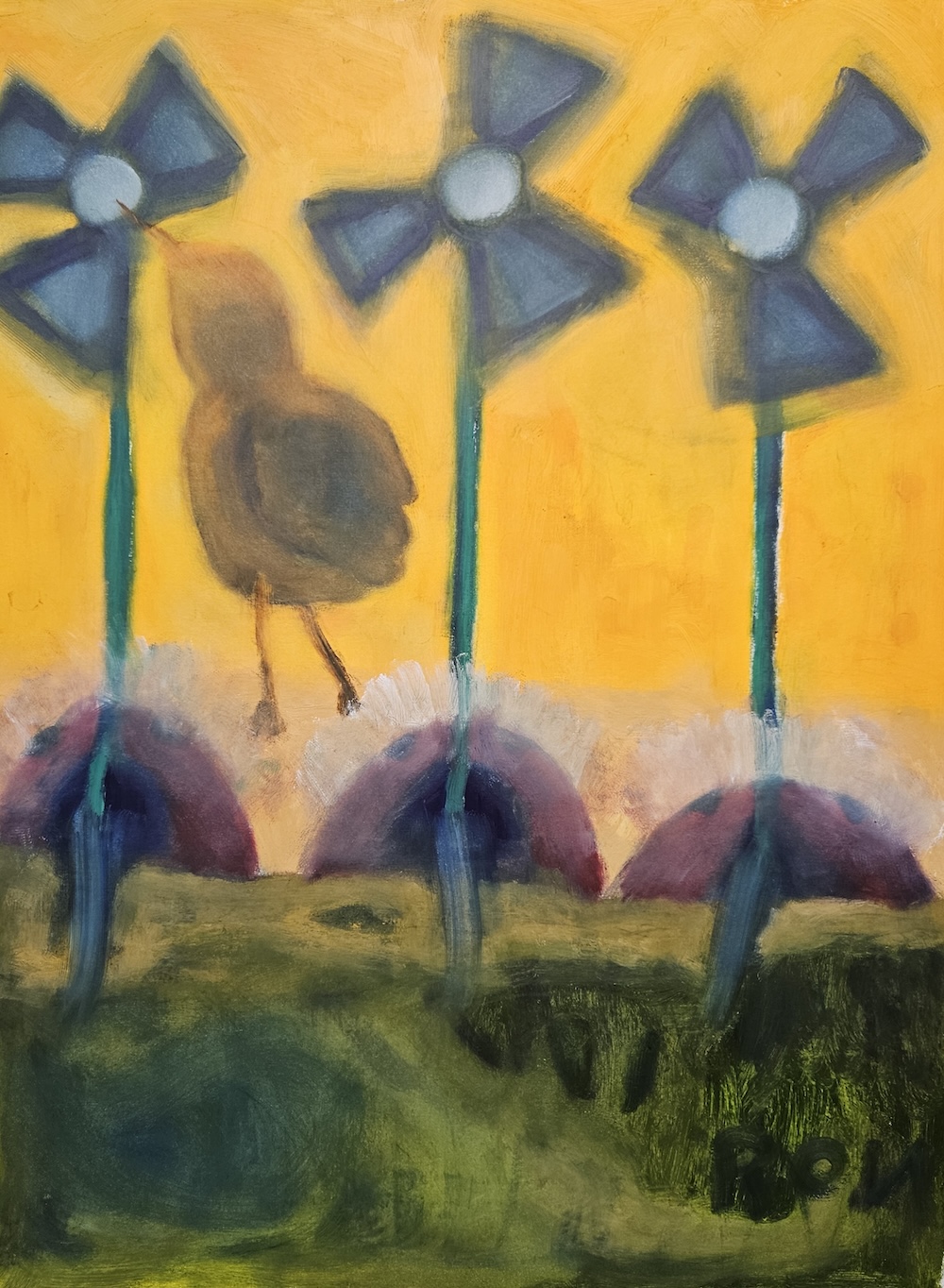 Who Wakes Up Painting an Irish Wheelchair and Nuclear Fallout? 2026. Oil on paper, 18 x 24"