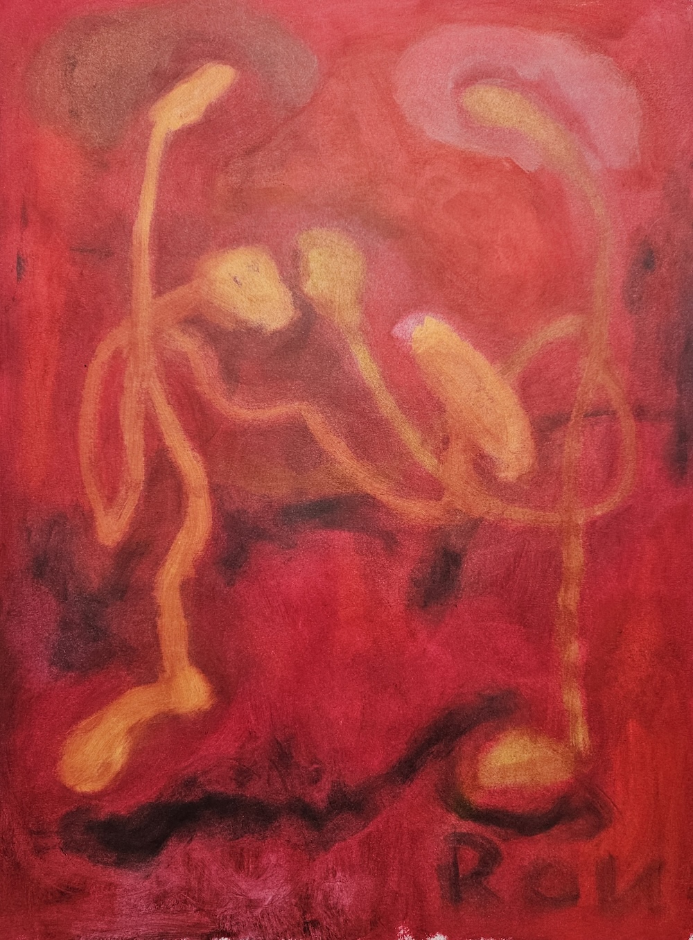 Friends Sparring Close to Hell 2026. Oil on paper, 18 x 24"