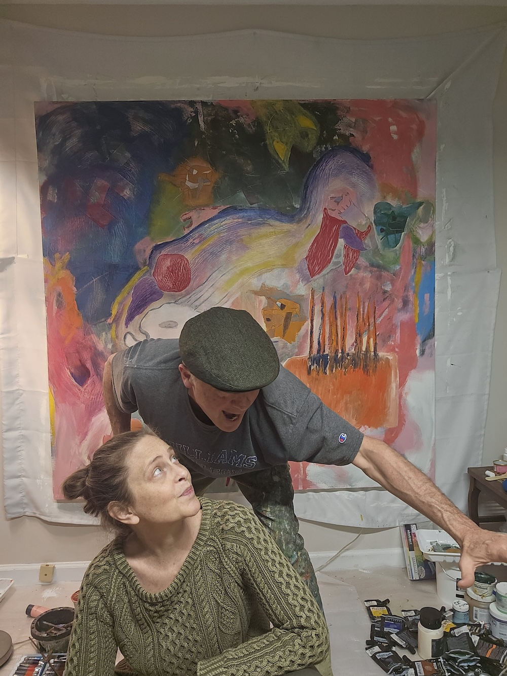 We have finished our fifth collaboration painting while a Saint Patrick’s Day blizzard blows away happy thoughts of spring. Oswego is a hard place for the artist. Somewhat better for self-flagellating monks and their pet cats. It’s a widely known, though mostly concealed fact, that modern people love their cats better than their friends, and they just abhor the monks. Artists are mostly monks with lusts rarely burdened by the guilt of an underperforming will. Aside from the exuberant love-making, the best artists, I believe, are better monks than the monks. Like a less bashful Saint Francis or Francesca, proudly stoking his id and making great art. Artists should seek a loose community of other unmade monk-artists, if just to pass the hair-shirt around the communal fire. Oswego is the perfect summer and fall climate for the alone-togetherness of working painters. The rest of the year is a dark frigid outpost of hell.