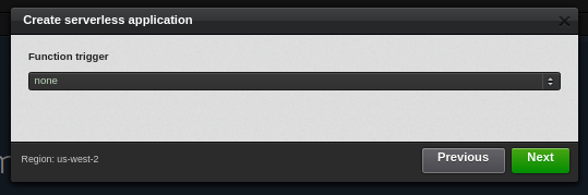 Here it's asking for a function trigger. We have no triggers setup yet. So for now we select none. Do NOT select API Gateway, this will allow you to put an API on top of your function, but it also adds cruft we won't be using because we won't be using the API gateway for this.