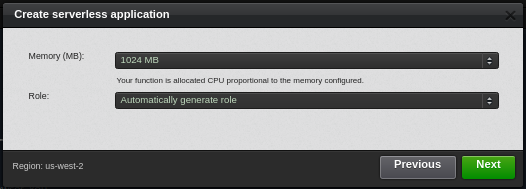 Pay attention here, you want 1 GB (1024 MB) of RAM available to your Lambda, don't go any higher or lower. Higher will cost money and lower could cause your bot to crap out at an inopportune time.