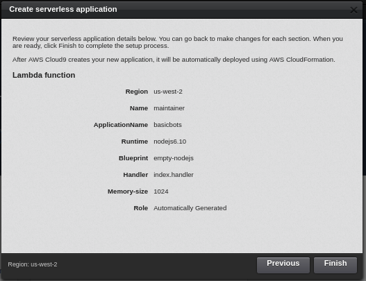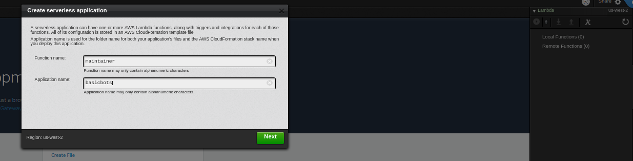 Here I've chosen the app name of basicbots and the function name of maintainer, click Next when done