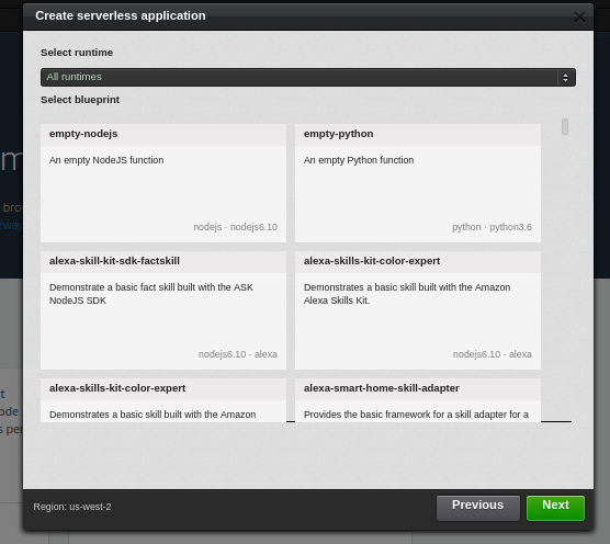 In the image above it can be easy to get lost in the options. Furthermore, AWS has had support for node 8.10 since April, yet the templates have not been updated to reflect this. Go ahead and just choose the first option here, empty-nodejs. I'm aware it says nodejs 6.10 but we will update it to be node 8.1 by the time we're done