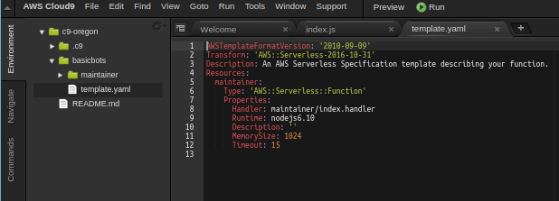 Here is my lambda fresh from the template system. We are going to need to change a few things. Open the template.yaml file