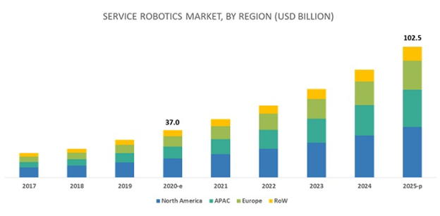 Short- and Medium-term ROI: Previously, robots and their services were expensive. The higher price meant ROI was expected to return in or after a decade. But with rapid growth of the robotics market enterprises are looking for short- and medium-term ROI. According a new survey the market is expected to grow 25.8% during the forecast period of 2020 and 2025.