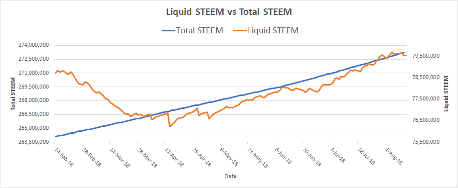 This is a historical graph of both Total STEEM and Liquid STEEM supply