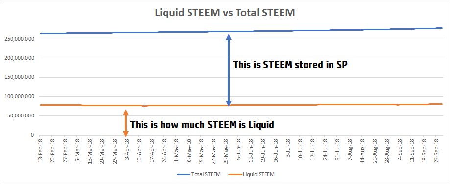 Liquid STEEM is the remaining STEEM that has not been converted into Steem Power. (Orange Line)