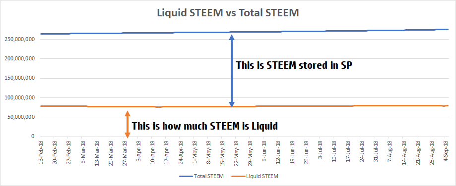 Liquid STEEM is the remaining STEEM that has not been converted into Steem Power. (Orange Line)