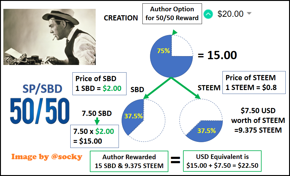 To demonstrate the effectiveness of the 50/50 reward structure, We need to assume a $2.00 SBD price. When the price of SBD is high, using the 50/50 reward option gives you more returns for your work. See in the illustration below how a $20 vote turns into a $22.50 USD value reward when the price of SBD is at $2.00.