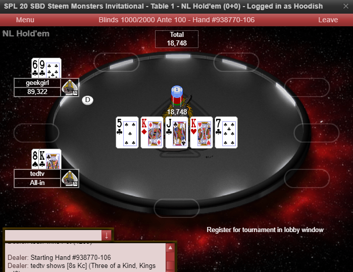 Stay tuned for the Bad Beat of the Week voting post! The winning loser will get 2 SBD for their trouble at the tables.