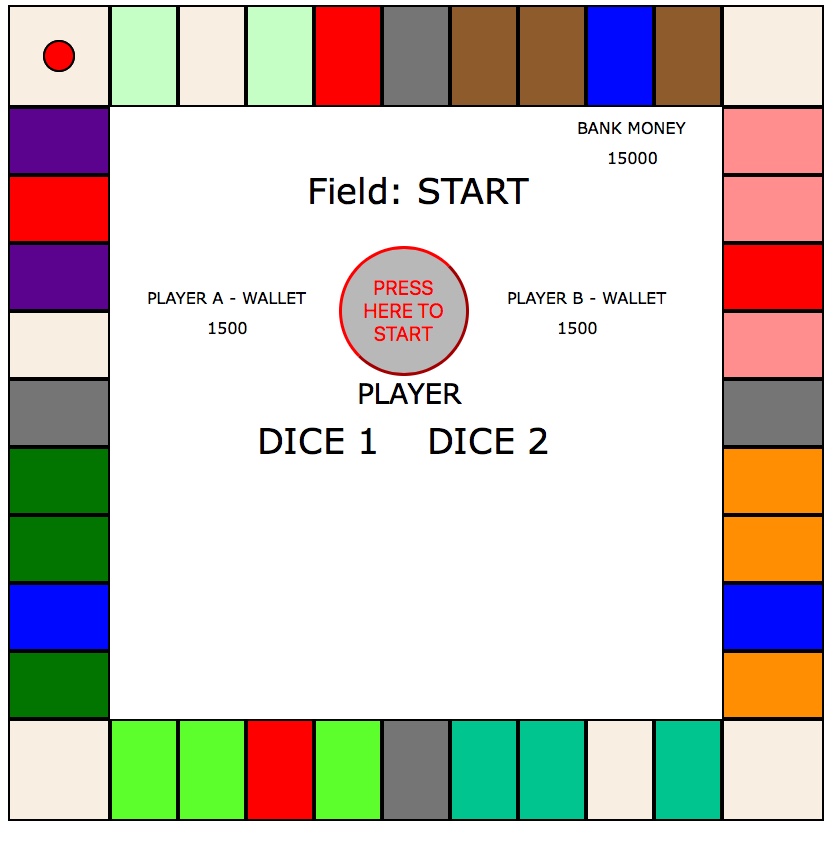 It is basically very similar to Monopoly. There are two virtual dices, 4 fields, personal wallets of the players and the bank.